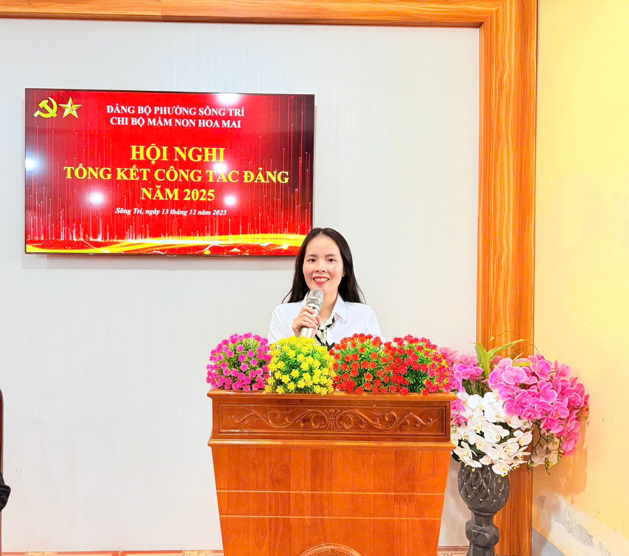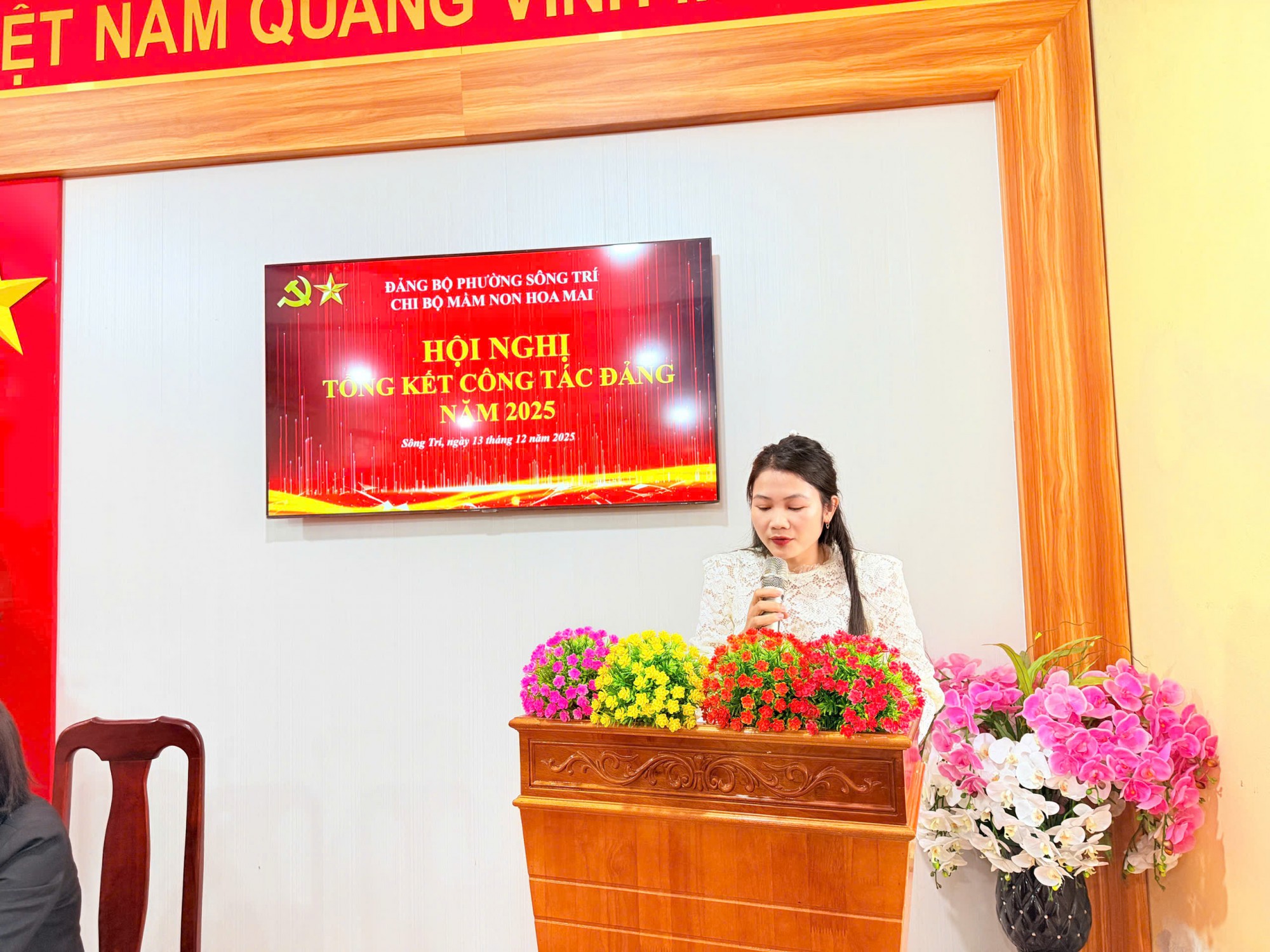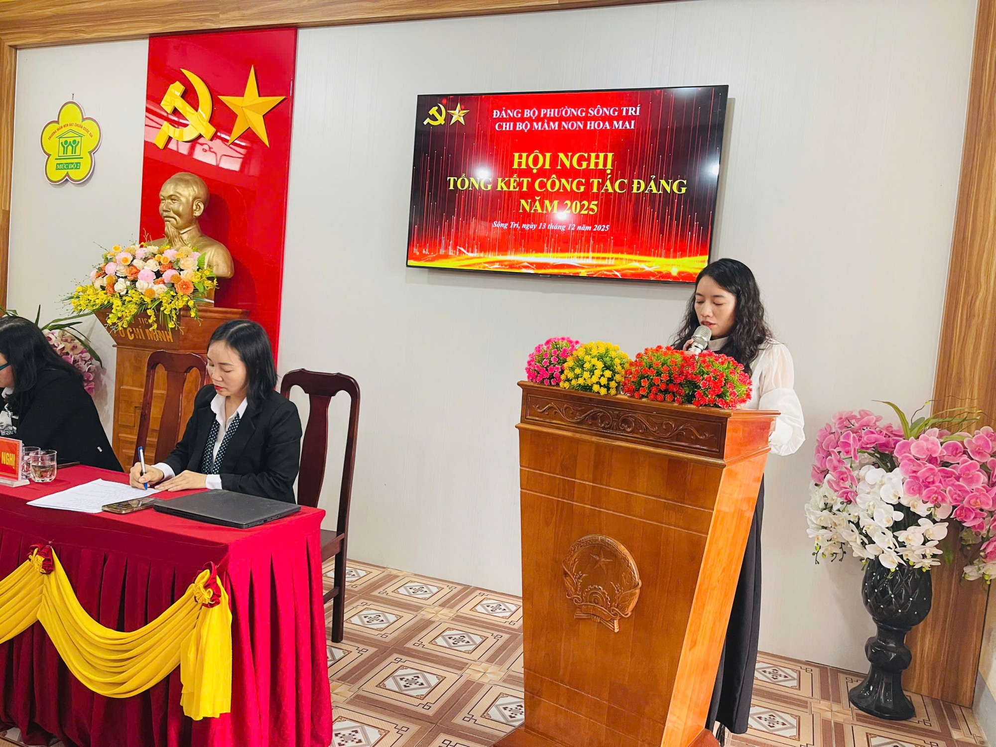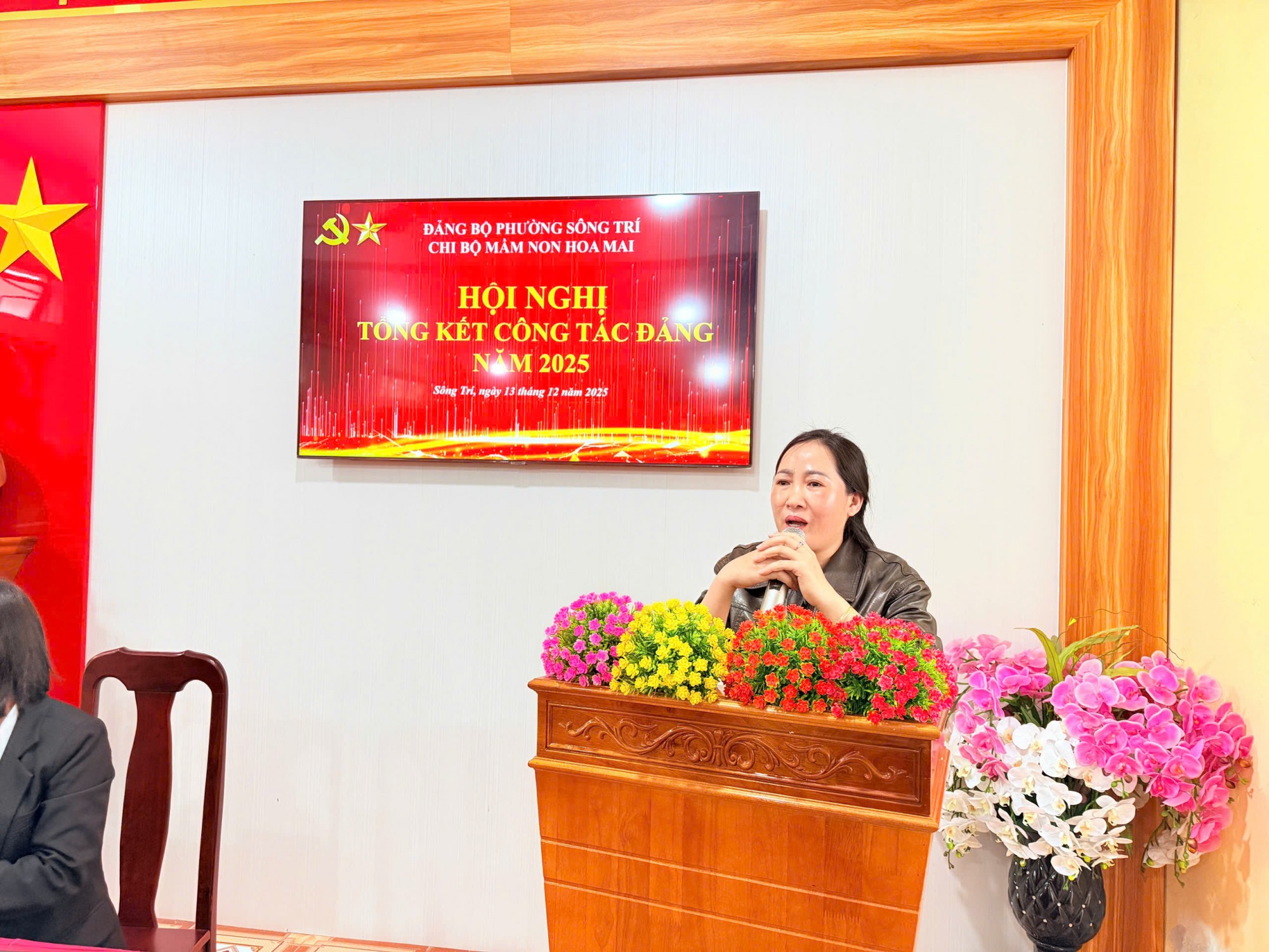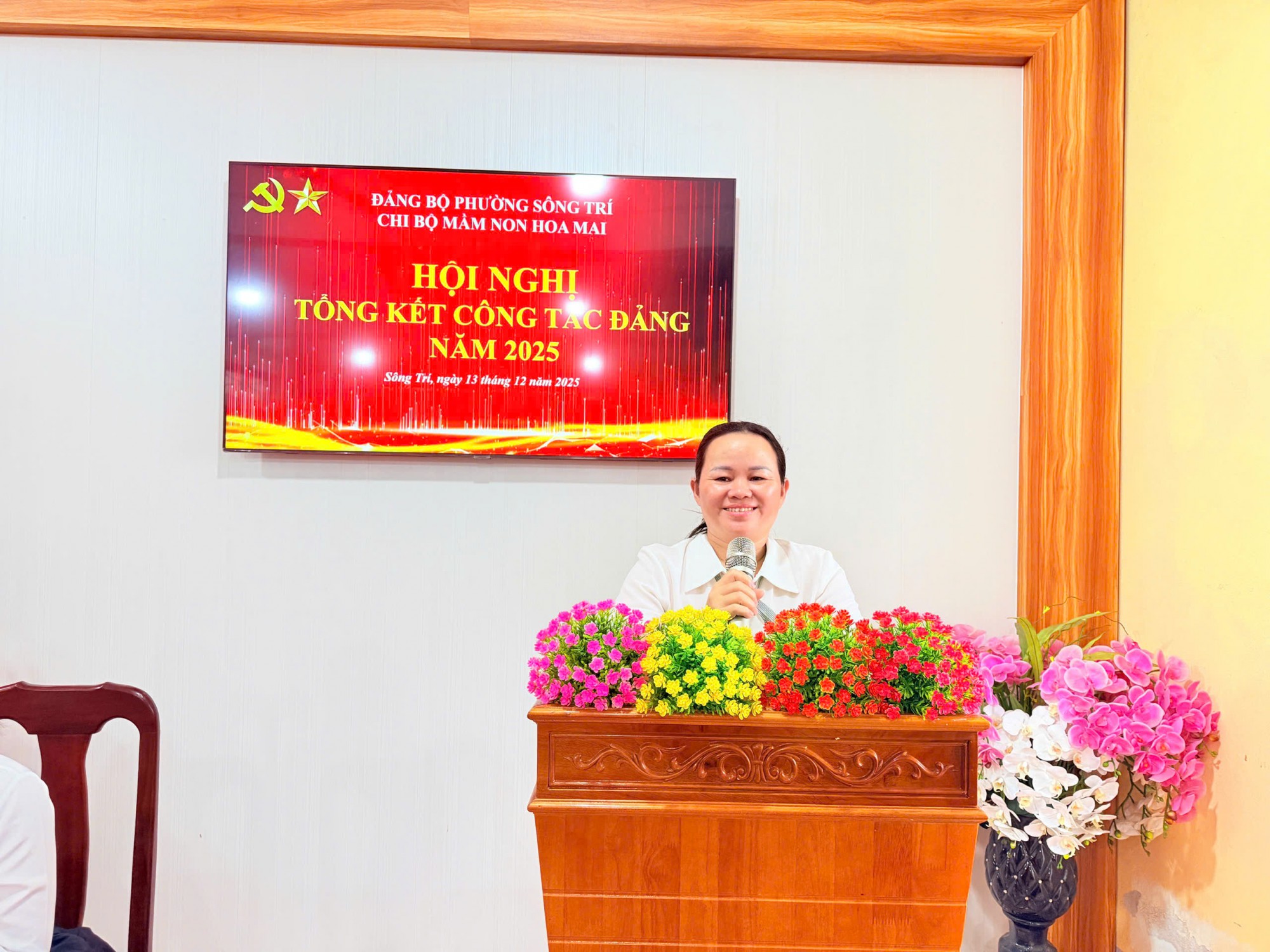 Đồng chí Lê Thị Hồng Mến. Chuyên viên Ban xây dựng Đảng phát biểu góp ý hội nghị Trên cơ sở các nội dung đã được thảo luận dân chủ, nghiêm túc, Hội nghị đã biểu quyết thống nhất qua biểu quyết thống nhất Nghị quyết công tác xây dựng Đảng năm 2025 và phương hướng nhiệm vụ năm 2026 của Chi bộ Trường Mầm non Hoa Mai. Nghị quyết xác định rõ các mục tiêu, nhiệm vụ và giải pháp trọng tâm, làm cơ sở để Chi bộ tổ chức lãnh đạo, chỉ đạo thực hiện hiệu quả công tác xây dựng Đảng và nhiệm vụ chuyên môn trong thời gian tới.