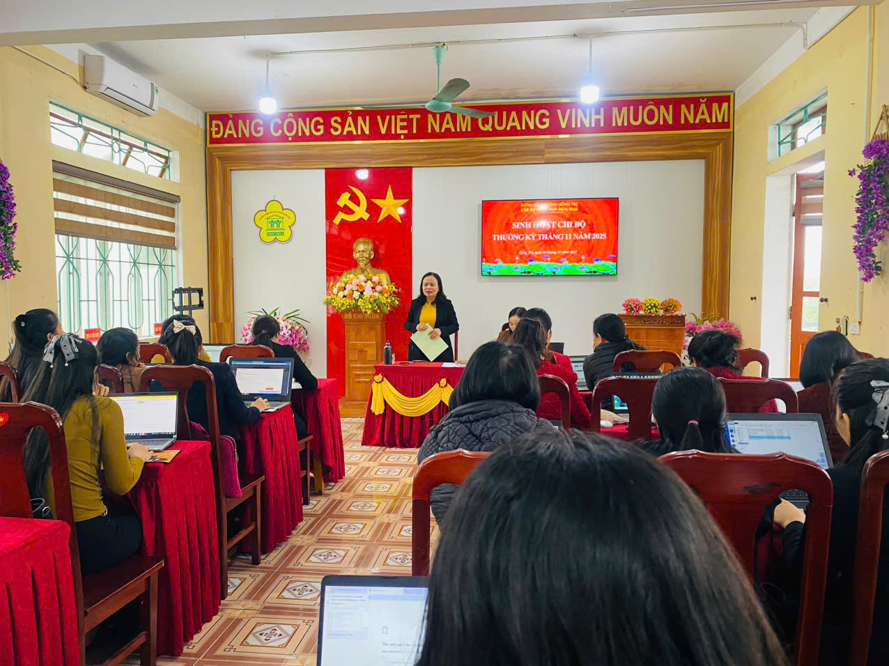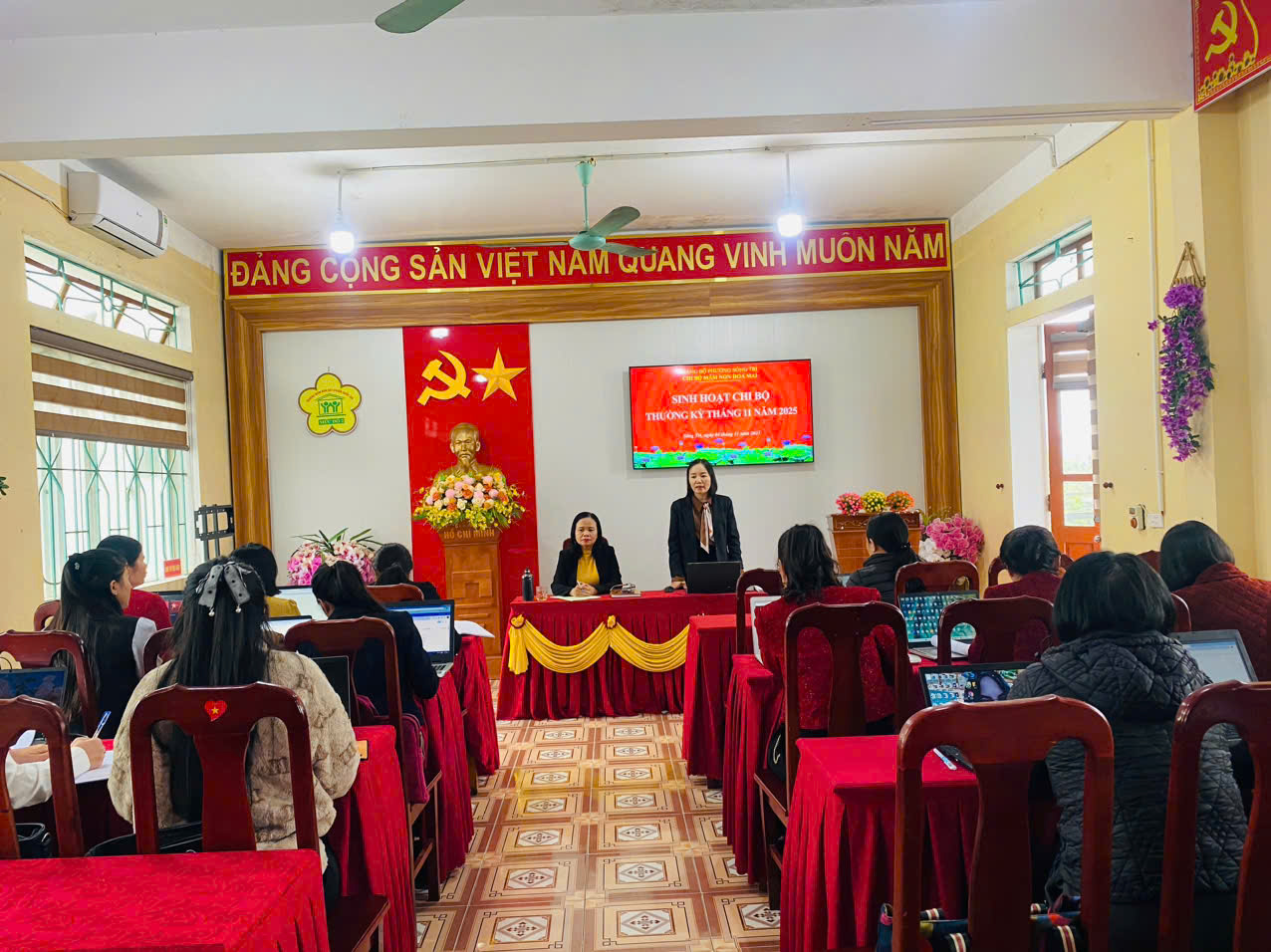 Tại buổi sinh hoạt, đồng chí Bí thư Chi bộ đã báo cáo kết quả công tác lãnh đạo, chỉ đạo trong tháng 10, đánh giá việc thực hiện nhiệm vụ chính trị, công tác chuyên môn, công tác xây dựng Đảng và các đoàn thể. và triển khai phương hướng, nhiệm vụ trọng tâm tháng 11, trong đó nhấn mạnh việc tiếp tục thực hiện tốt phong trào thi đua dạy tốt - học tốt, đẩy mạnh công tác chuyển đổi số, và nâng cao chất lượng sinh hoạt chi bộ theo hướng thực chất, hiệu quả.