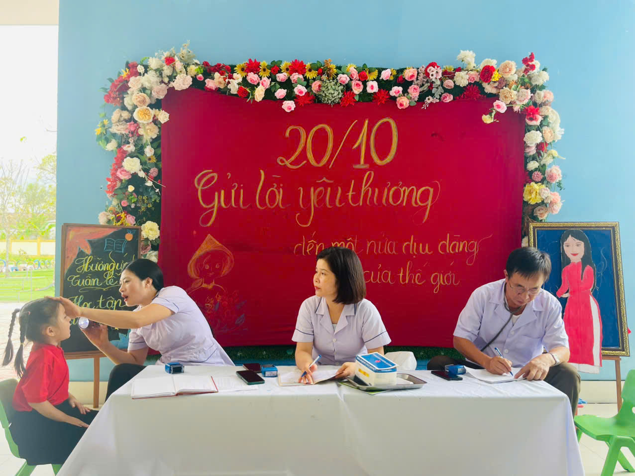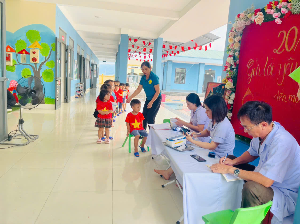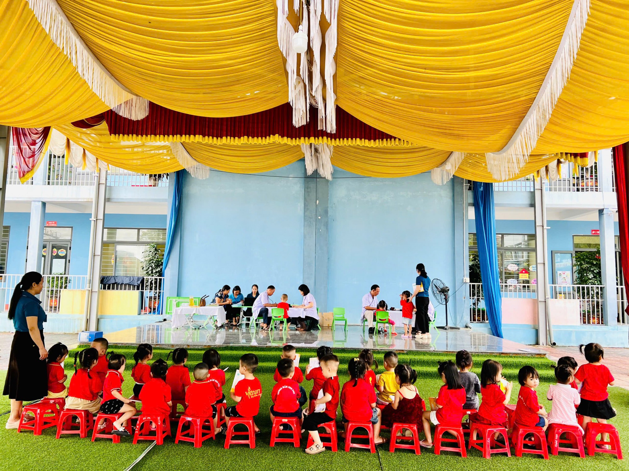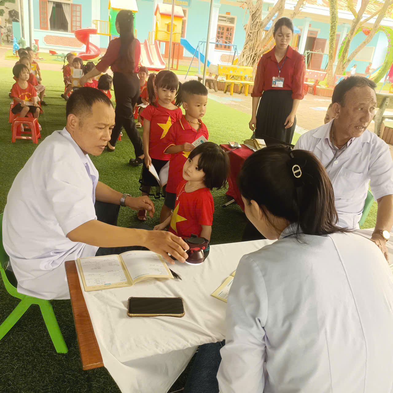Các nhân viên y tế tiến hành khám tổng quát cho trẻ đo chiều cao, cân nặng, kiểm tra tai- mũi -họng, răng - miệng, da liễu. Kết quả được ghi chép cẩn thận vào sổ theo dõi sức khỏe của từng trẻ. Những trường hợp có dấu hiệu bất thường sẽ được nhà trường thông tin sớm để phụ huynh phối hợp chăm sóc và khám chuyên sâu khi cần thiết.