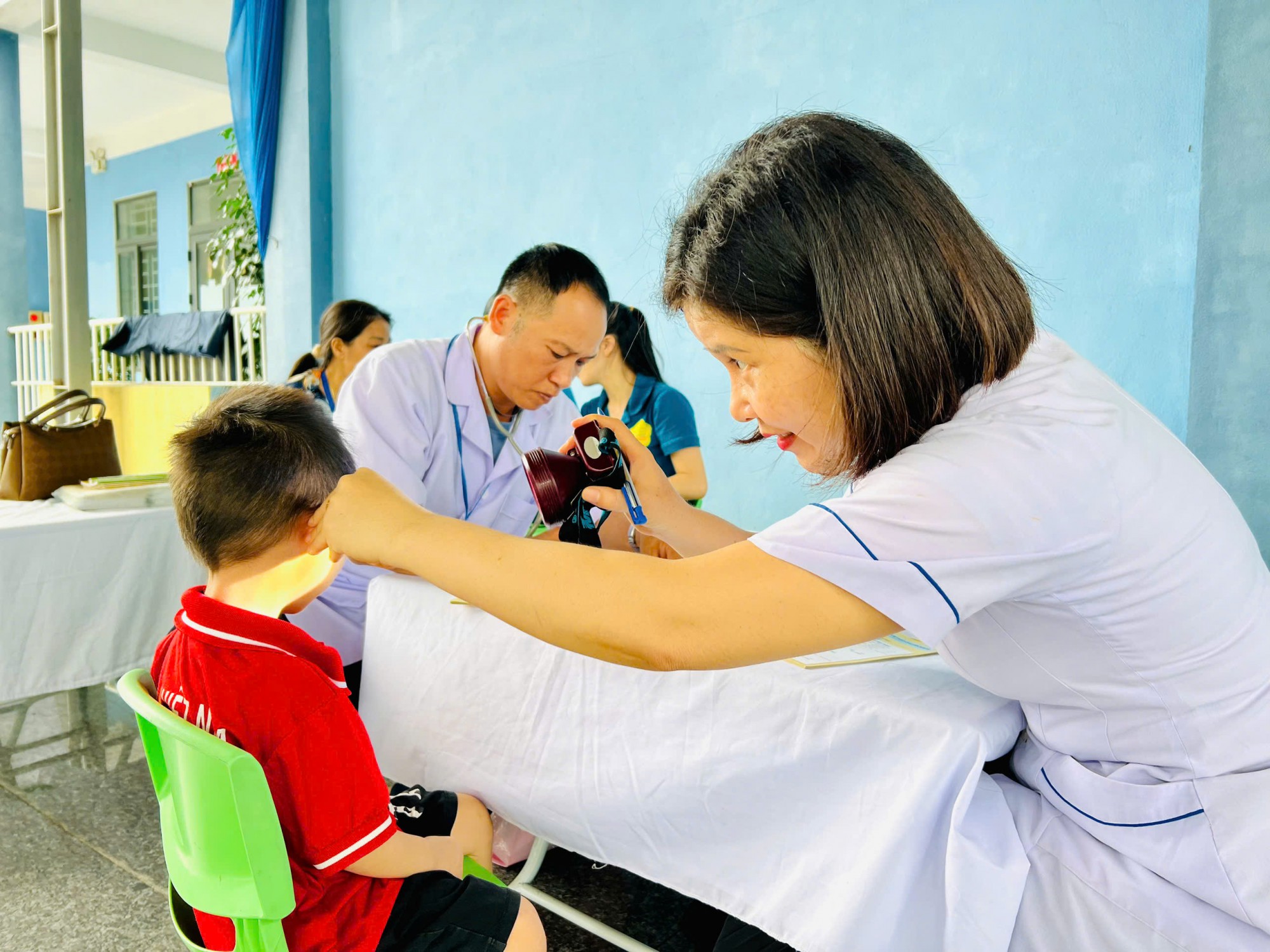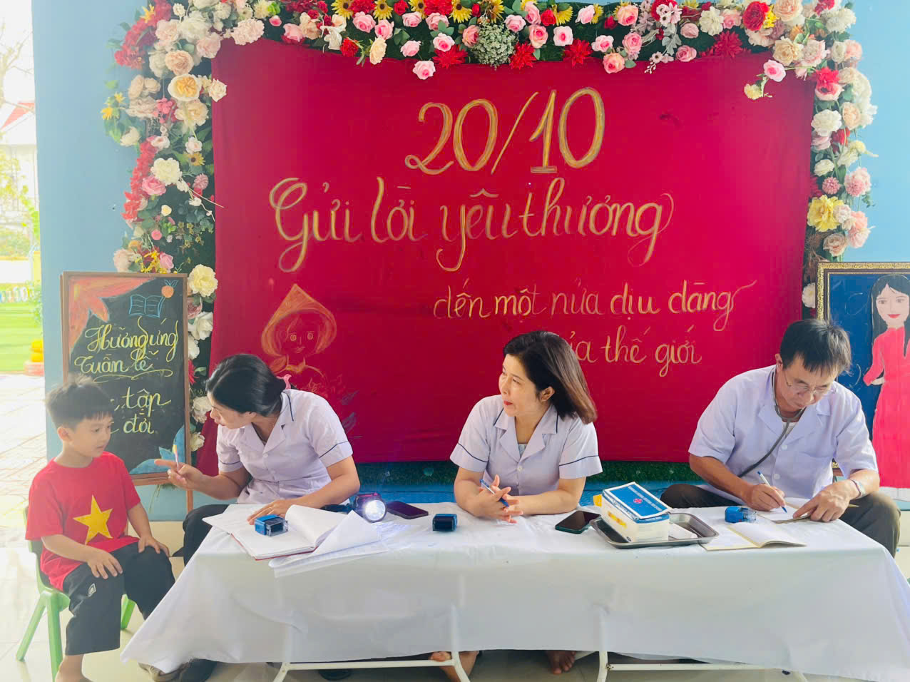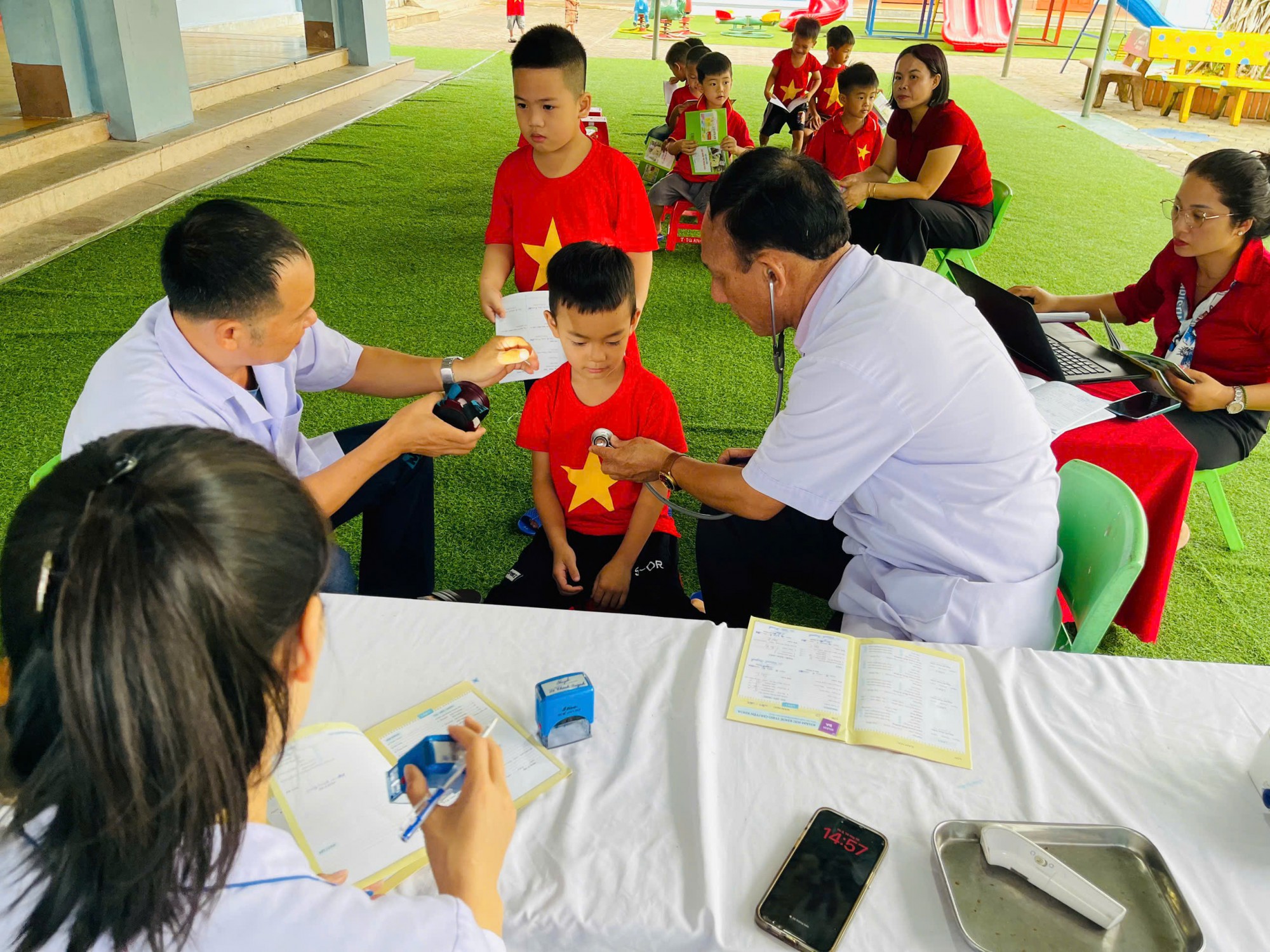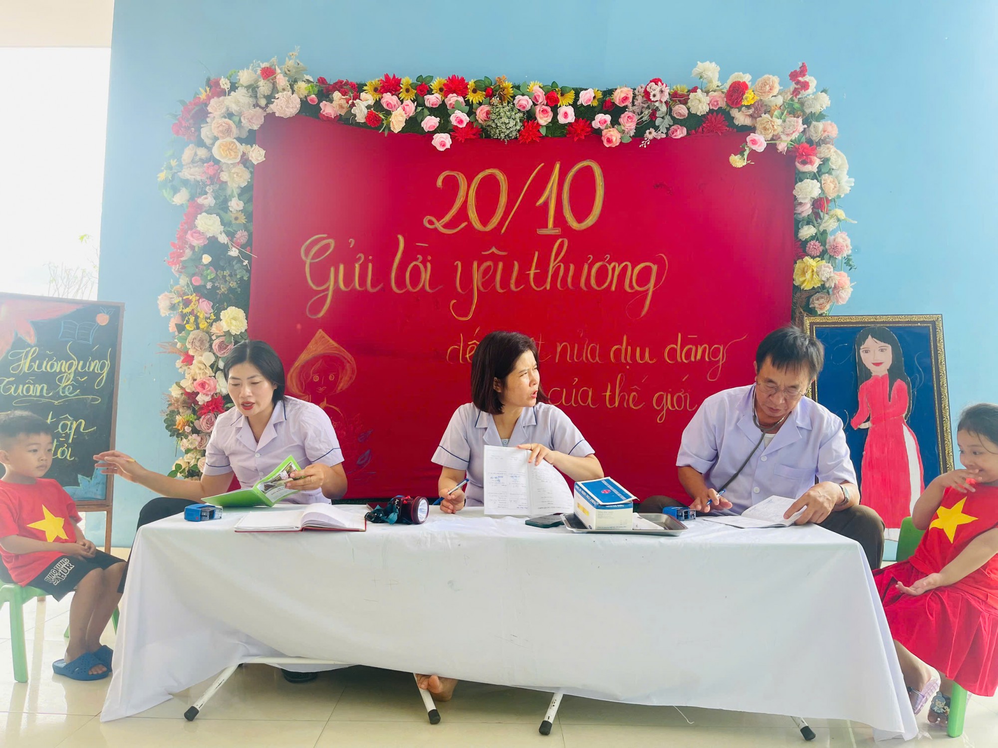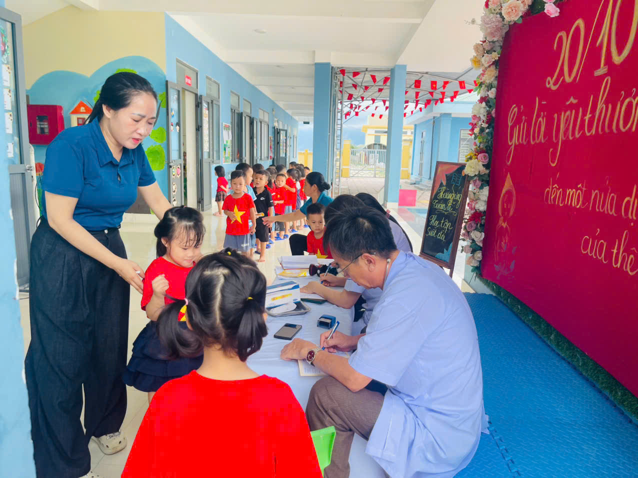 Các nhân viên y tế tiến hành khám tổng quát cho trẻ đo chiều cao, cân nặng, kiểm tra tai- mũi -họng, răng - miệng, da liễu. Kết quả được ghi chép cẩn thận vào sổ theo dõi sức khỏe của từng trẻ. Những trường hợp có dấu hiệu bất thường sẽ được nhà trường thông tin sớm để phụ huynh phối hợp chăm sóc và khám chuyên sâu khi cần thiết.