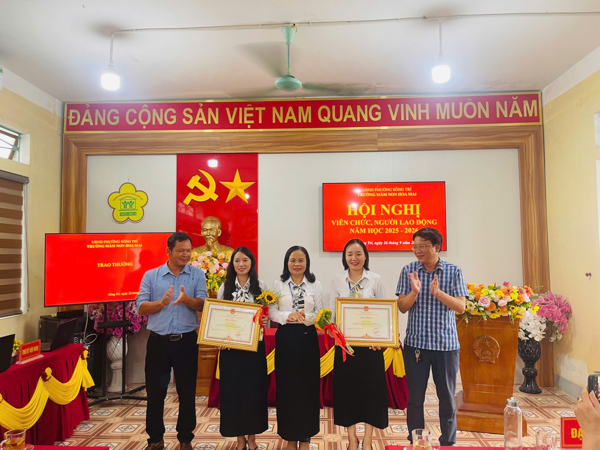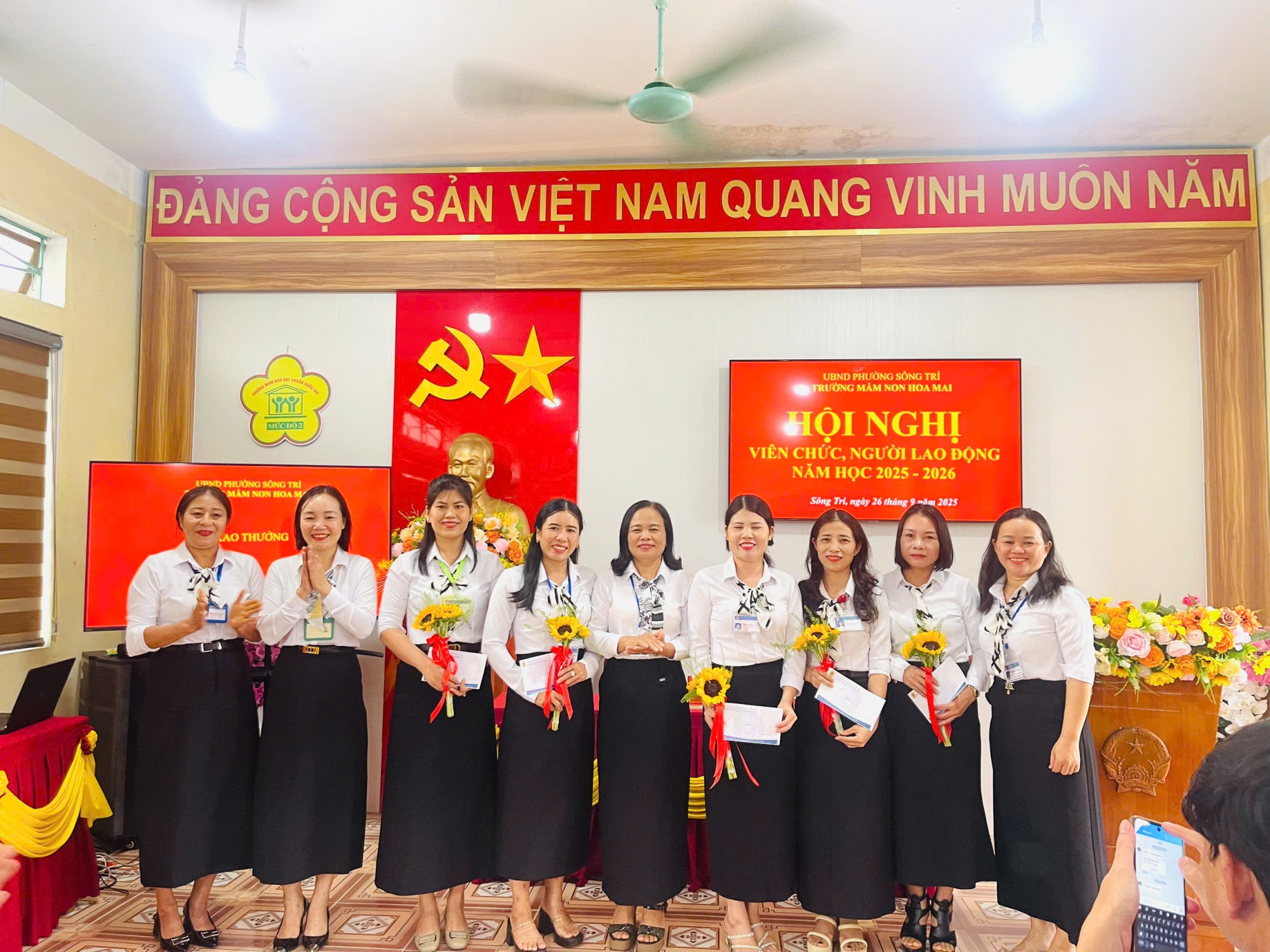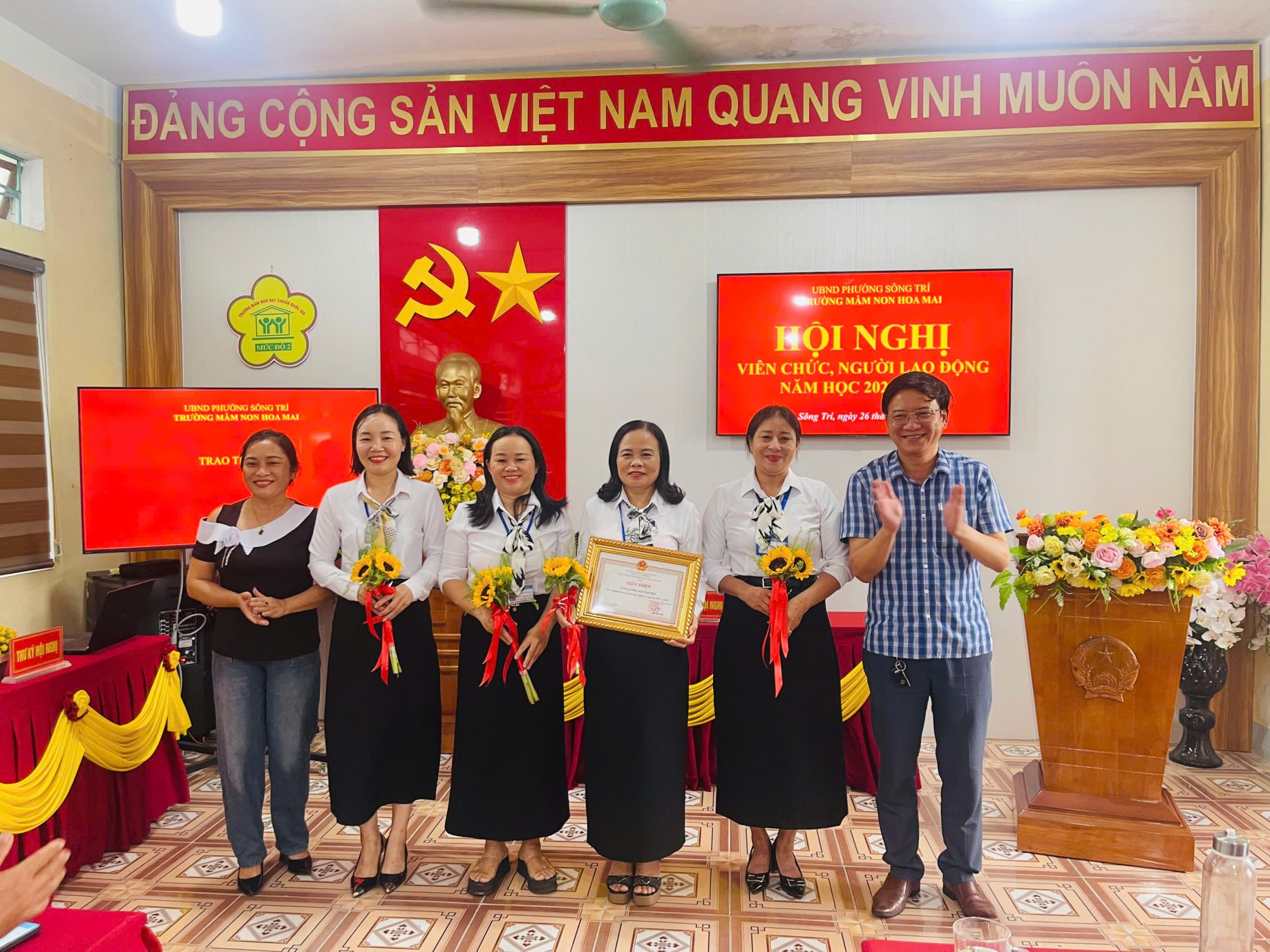 Đại biểu trao thưởng tập thể lao động Tiên tiến Với tinh thần làm việc nghiêm túc, dân chủ, trách nhiệm cao, Hội nghị đã thống nhất thông qua nghị quyết Hội Nghị viên chức, người lao động năm học 2025 - 2026. Đây là cơ sở quan trọng để tập thể Trường Mầm non Hoa Mai phấn đấu hoàn thành thắng lợi các mục tiêu của năm học mới.