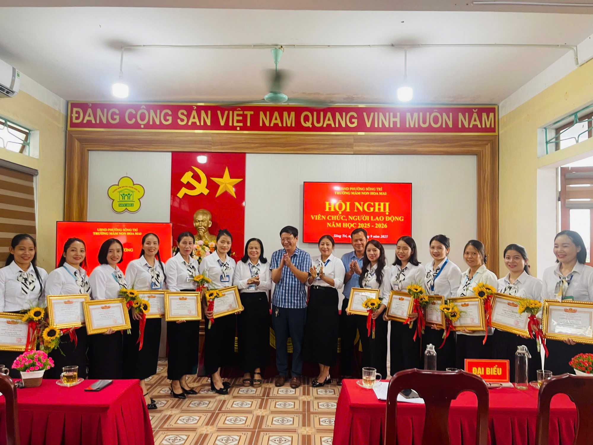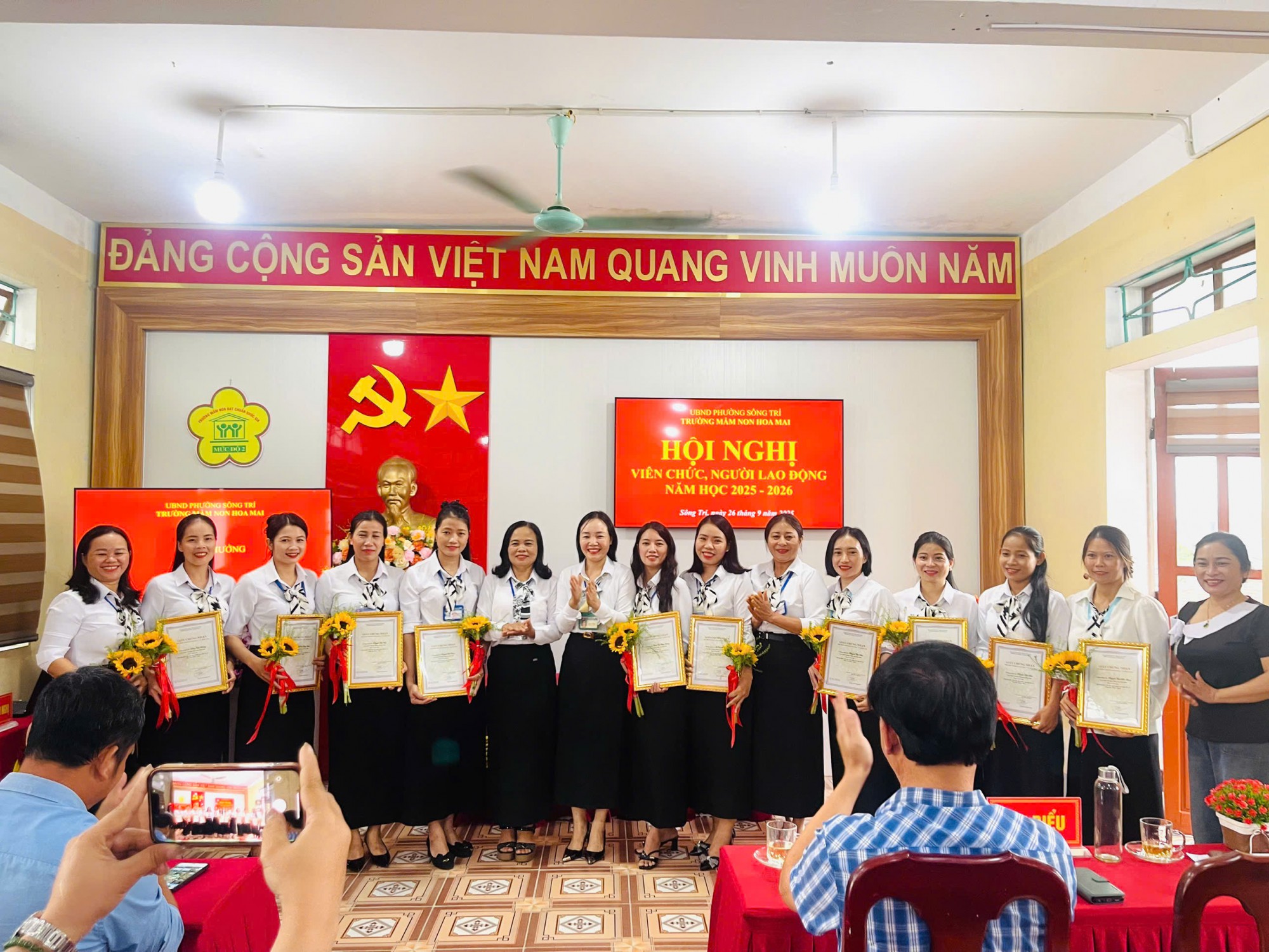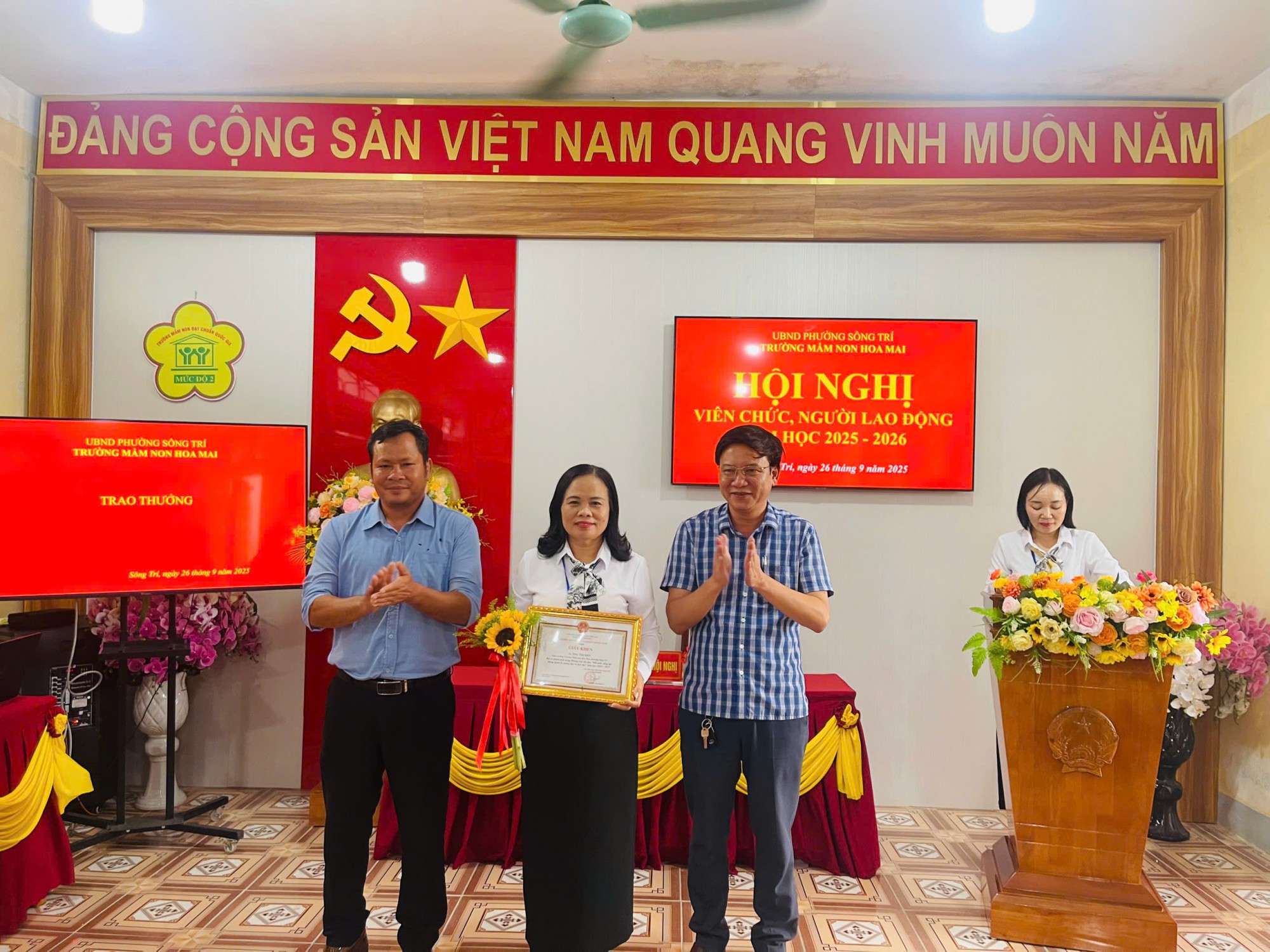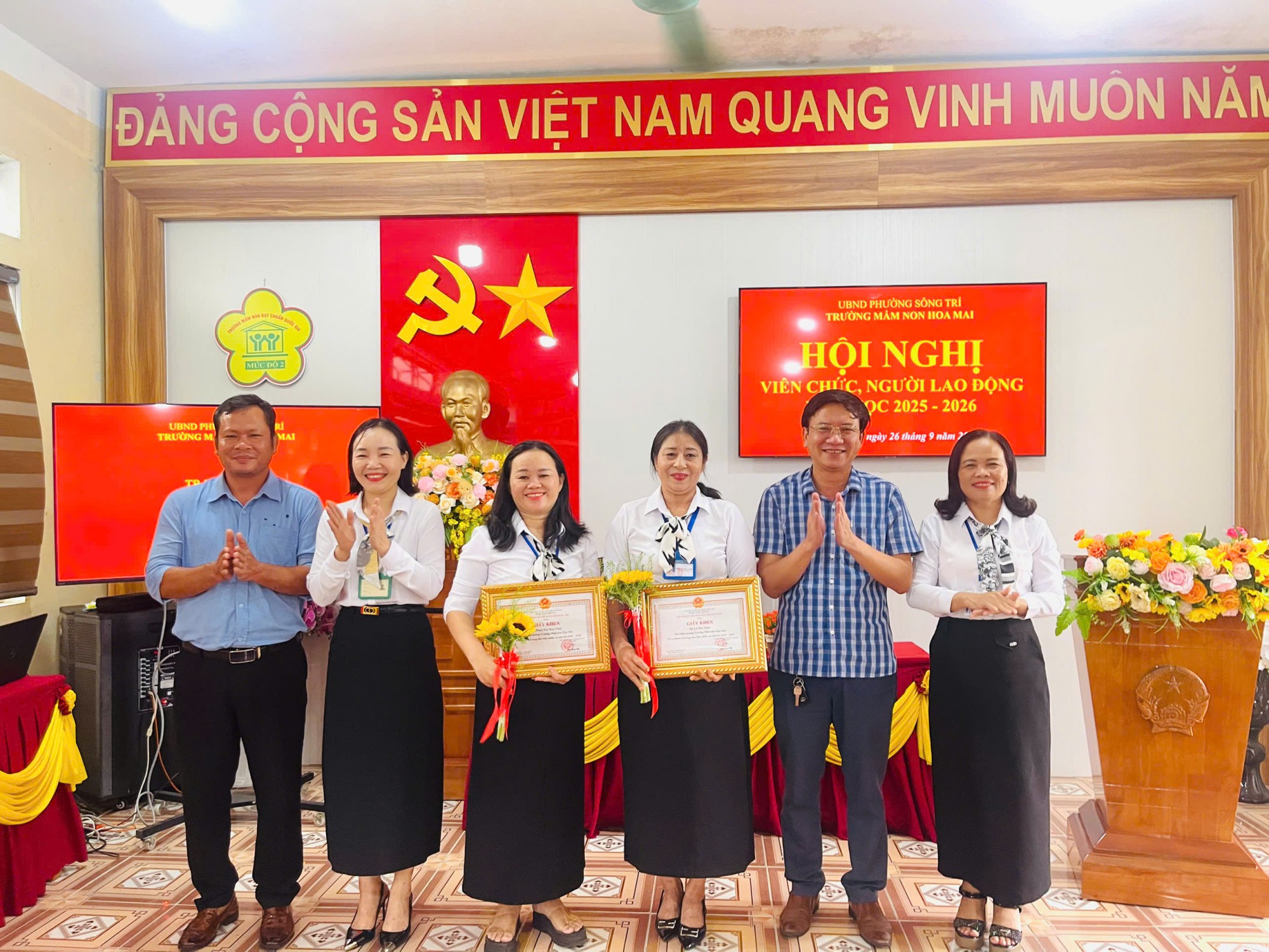 Đại biểu trao thưởng tập thể lao động Tiên tiến Với tinh thần làm việc nghiêm túc, dân chủ, trách nhiệm cao, Hội nghị đã thống nhất thông qua nghị quyết Hội Nghị viên chức, người lao động năm học 2025 - 2026. Đây là cơ sở quan trọng để tập thể Trường Mầm non Hoa Mai phấn đấu hoàn thành thắng lợi các mục tiêu của năm học mới.